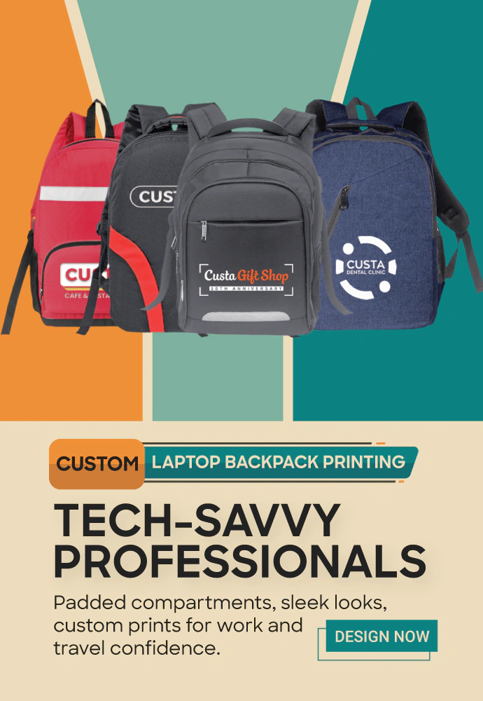 Laptop backpacks feature padded compartments and ergonomic designs, perfect for commuters or students. Customizable with silk screen or DTF printing, they offer organized storage and weather resistance. CUSTA’s custom laptop backpacks protect your gear while showcasing your style.