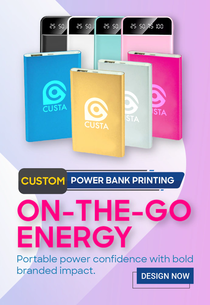 Keep your devices charged anytime, anywhere with our versatile range of power banks. Designed for any occasion or event, they offer reliable backup power with capacities suitable for both everyday use and heavy-duty charging needs. Add your own design or logo with CUSTA to create a personalized, practical, and memorable item your audience will appreciate.